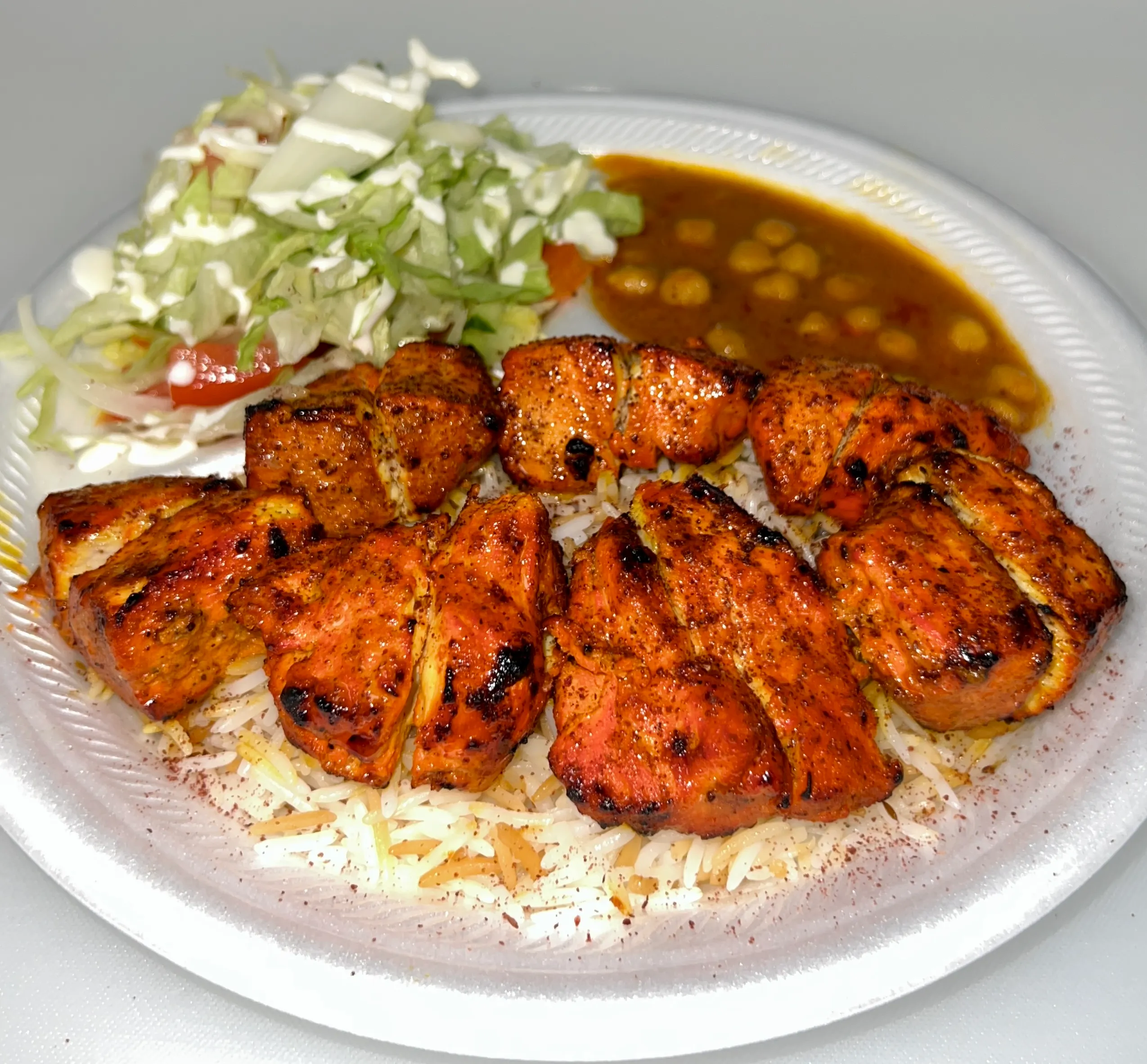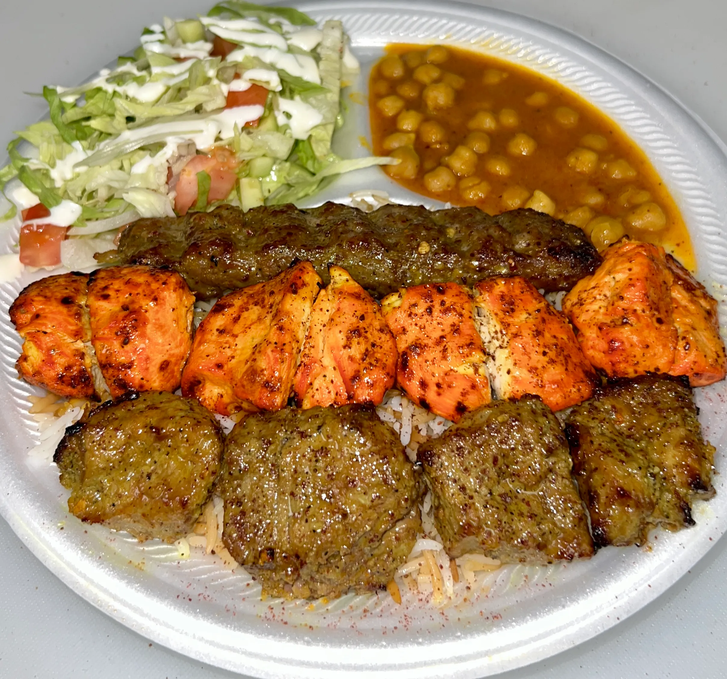 A Combination Of Tender Lamb, Juicy Chicken, And Seasoned Ground Beef Kabobs, Served With perfectly cooked Basmati Rice, Chickpeas, Fresh Vegetables, Freshly made Tandoori Naan bread and homemade sauces.