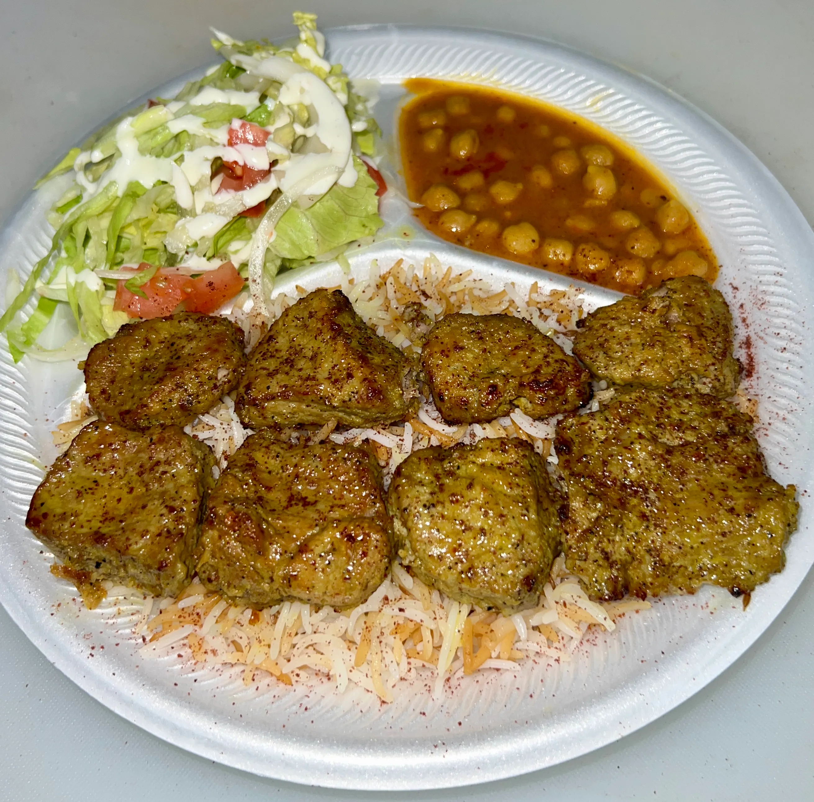 Shami (Ground Beef) Kabobs Served Over Seasoned Rice, Accompanied By Chickpeas In A Rich Sauce, Fresh Salad, Tandoori Naan bread and Homemade sauces.