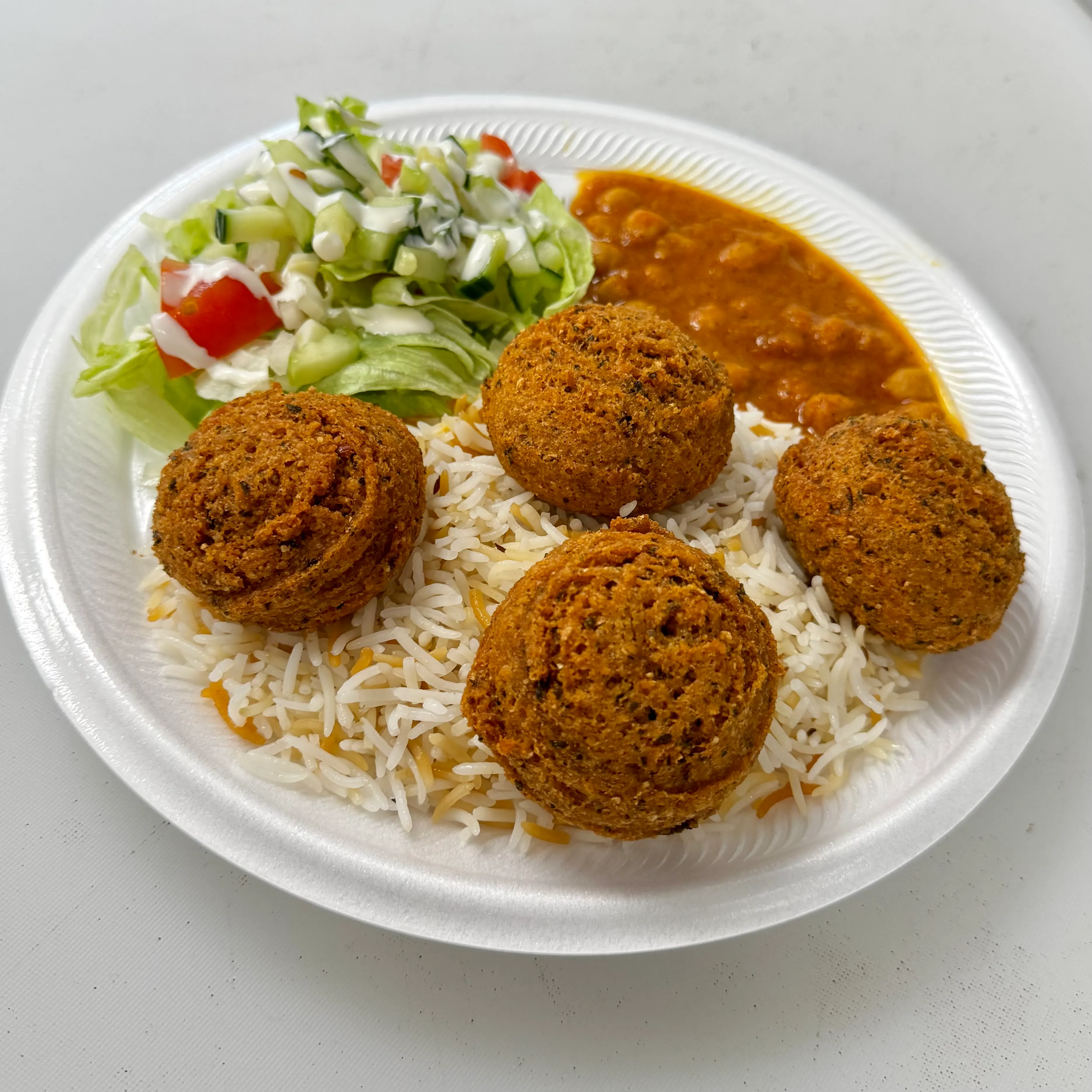 Crispy Falafels Served With Basmati Rice, Chickpeas Curry, Tandoori fresh Naan bread, Fresh Vegetable Salad and homemade sauces.