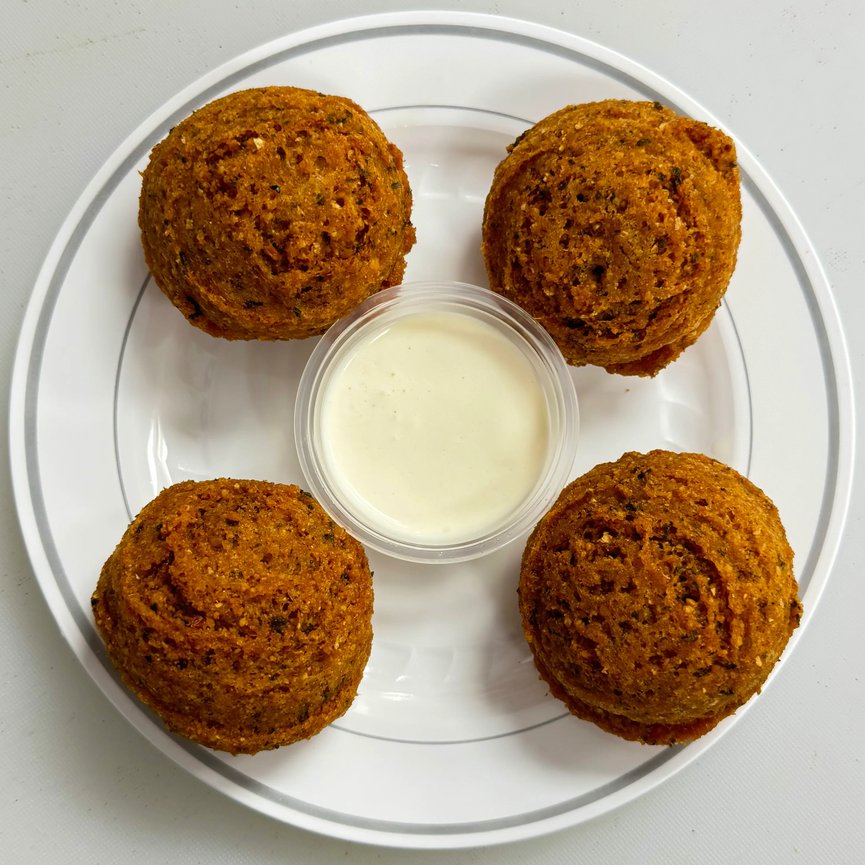 Crispy Chickpea Balls Seasoned With Herbs And Spices, Served With A Side Of Creamy Tahini Sauce.